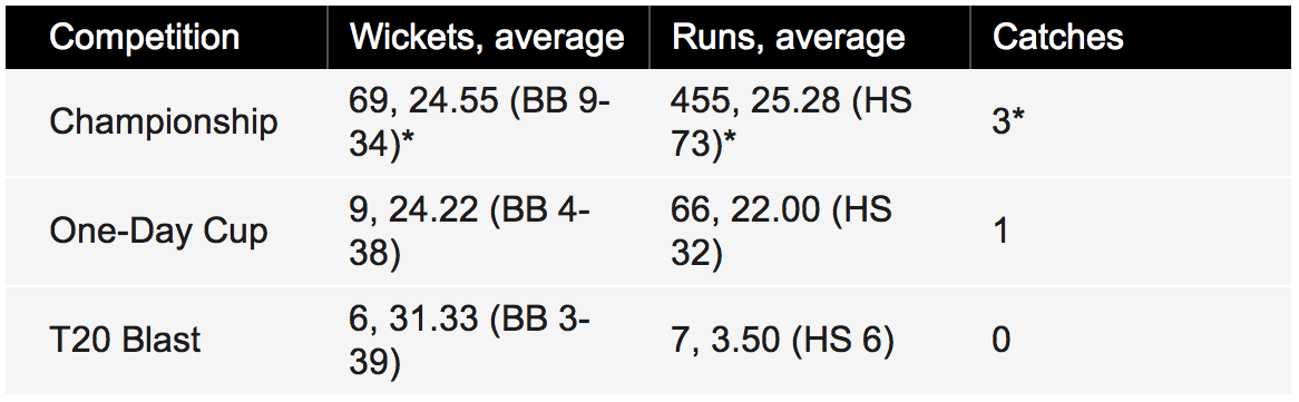 “Starting with a bang, Harris has been relentless all season, second only to Chris Rushworth in the total wickets tally in Division One, and his recent five-for against champions Yorkshire gave further evidence that he can mix with the best of them.
